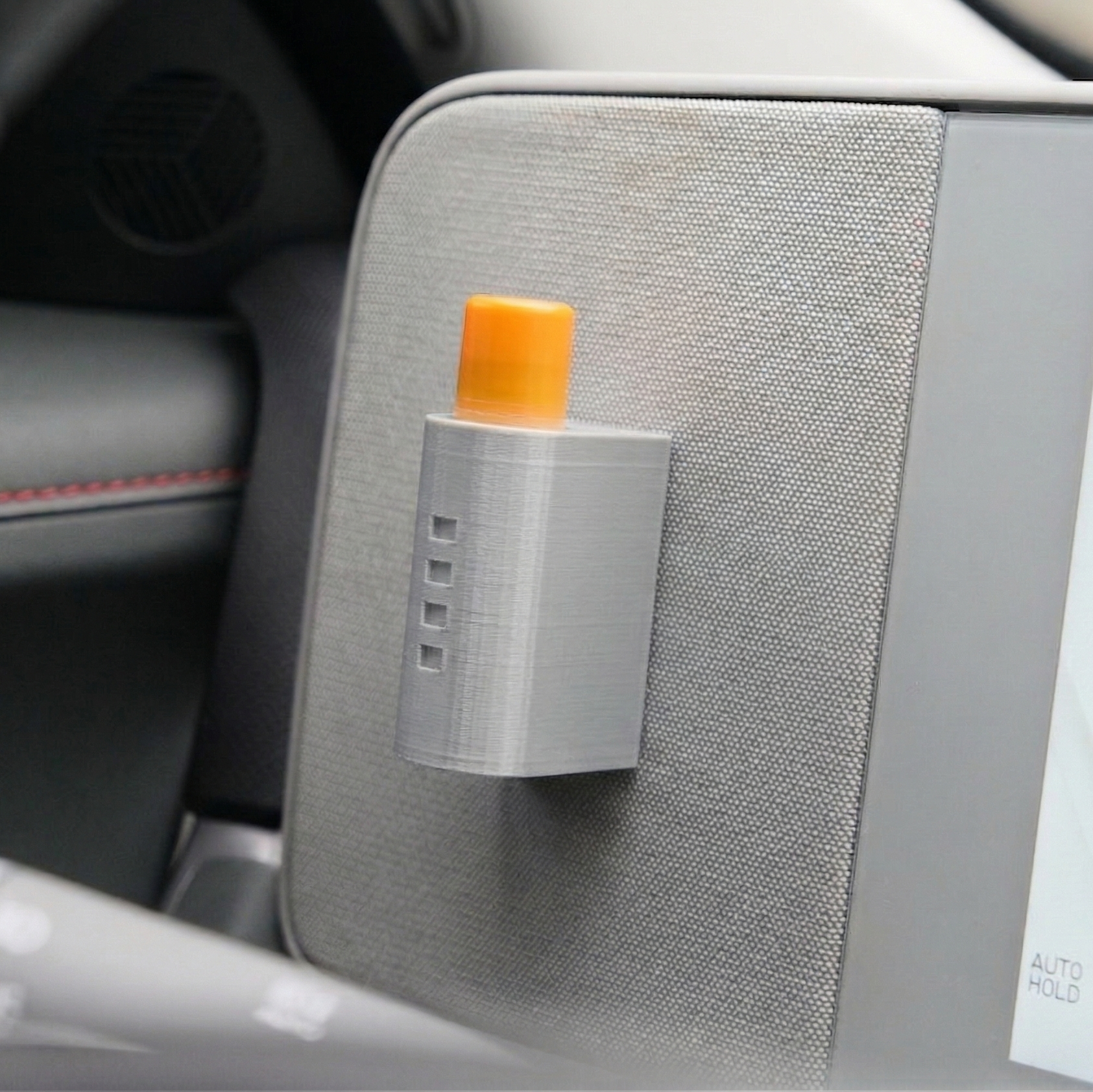 Un artilugio de plástico que guarda un tubo de bálsamo labial de tamaño estándar convenientemente en el salpicadero de tu Ioniq 5, Ioniq 9 o vehículo Hyundai con esta misma almohadilla accesoria cubierta de tela.